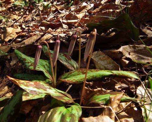 以西では希少種なので採取しないでください。3月から1枚葉が出て来て、4月には2枚葉の花芽を付けたの出てきて、花を咲かせ、5月