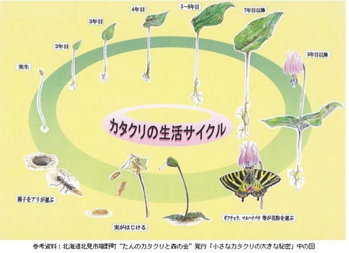 カタクリは秋の終わり頃、すでに鱗茎が活動を開始している。1枚葉の展開は3月初旬、2枚葉の開花個体の場合は約10日程遅れる。