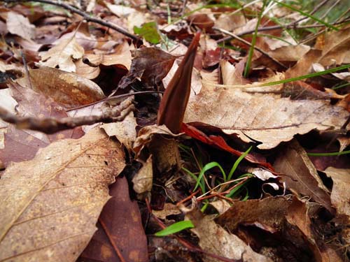その後 2枚の葉で花芽を包んだカタクリが土を突き抜けて地表に出て来る。