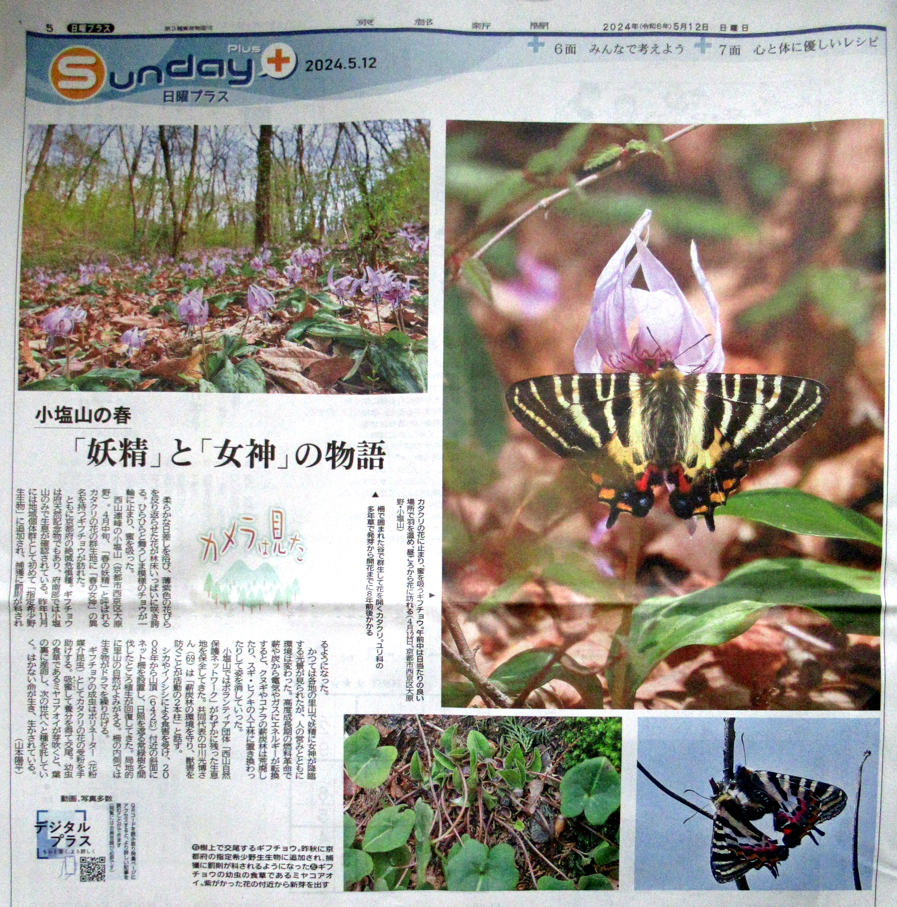 今年の花ボラについて、京都新聞-京都市版(4月14日)に佐々木千奈記者の記事が掲載されたのに続き、5月12日(日)朝刊に同社報道写真部の山本陽平さんが撮影されたカタクリ、ギフチョウの写真が掲載されました。