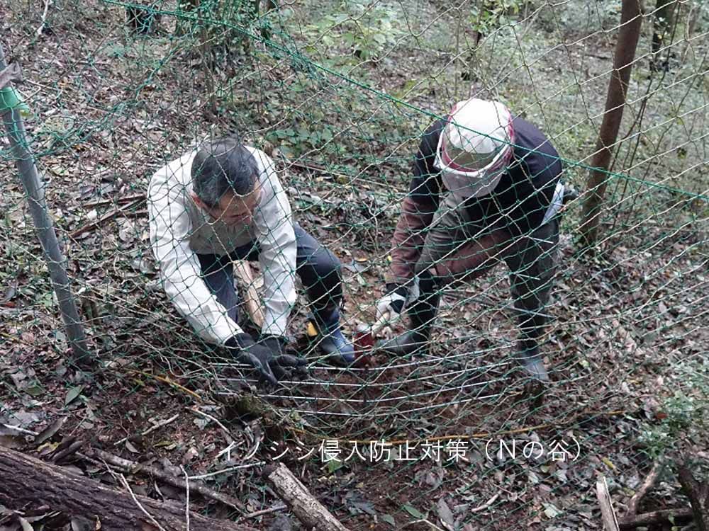 被害が起こりました。そこでイノシシ対策チームを発足して、月1回、活動期は2回のネットの周囲を巡回点検し、侵入箇所