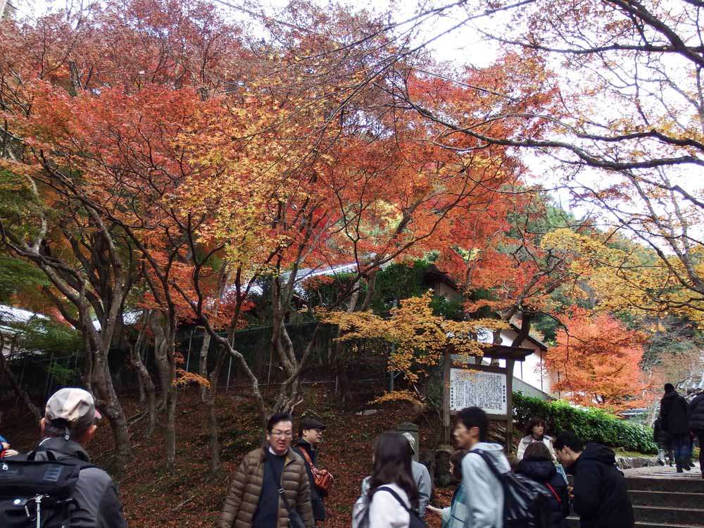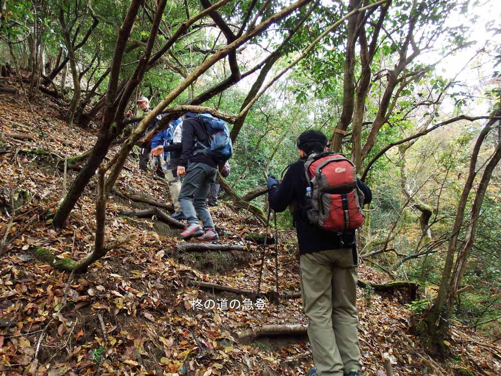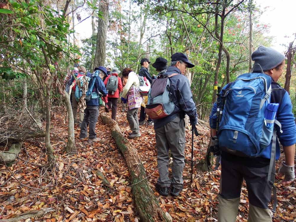 1年ぶりの大文字山です。17人もの多数の参加で賑やかな山行になりました。3組のご夫婦参加は初めてです。藤田真理子リーダー、堀元美佐子サブリーダーは「大文字山は「自分たちの庭」として多くのコースを歩かれています。「今日は初めてのメタセコイア道を通って中尾ノ滝に向かいます。」とのコース説明で初コースに興味津々です。登りだすと整備された登山道になっていて背高のっぽのメタセコイアがあちこちに見られ、きれいに、黄色に染まって存在をアピールしています。中尾ノ滝、幻ノ滝の紅葉ポイントも今年は紅から黄色になっていて昨年とは違った景色を醸し出していました。山頂には多くの登山客であふれ、さすが大文字山は京都人の好きな山です。昼食後の記念写真は他のグループと来られていた高田さんが加わり18人でパチリ。帰路はトレイルコースを下って南禅寺に到着。予定より1時間早く終礼後、解散しました。南禅寺には多くの観光客が残り紅葉を楽しんでいました。