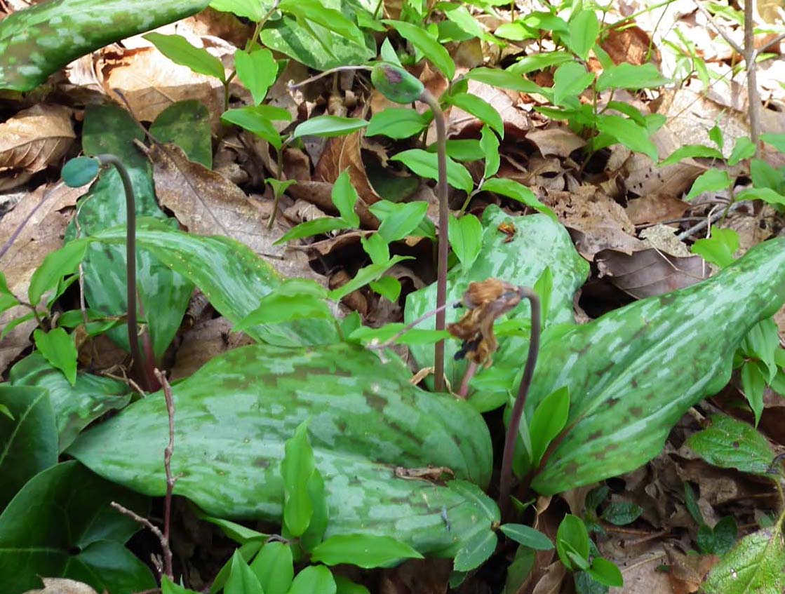 以西では希少種なので採取しないでください。3月から1枚葉が出て来て、4月には2枚葉の花芽を付けたの出てきて、花を咲かせ、5月