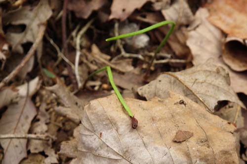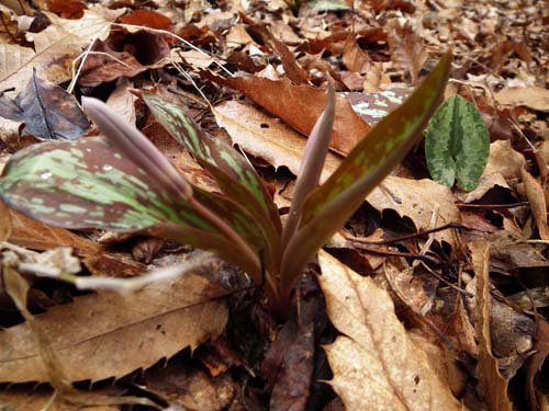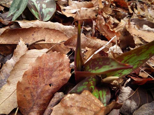 その後 2枚の葉で花芽を包んだカタクリが土を突き抜けて地表に出て来る。